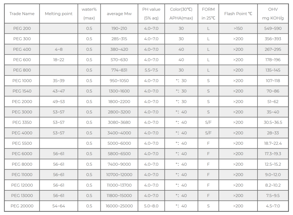 PEG-200 hanggang PEG-600: Mababang timbang ng molekular, likido. Ang mga ito ay may mababang lagkit at mahusay na solubility sa tubig, at karaniwang ginagamit bilang mahusay na mga solvent, plasticizer at humectants, na malawakang inilalapat sa mga kosmetiko at pharmaceutical na likidong paghahanda.